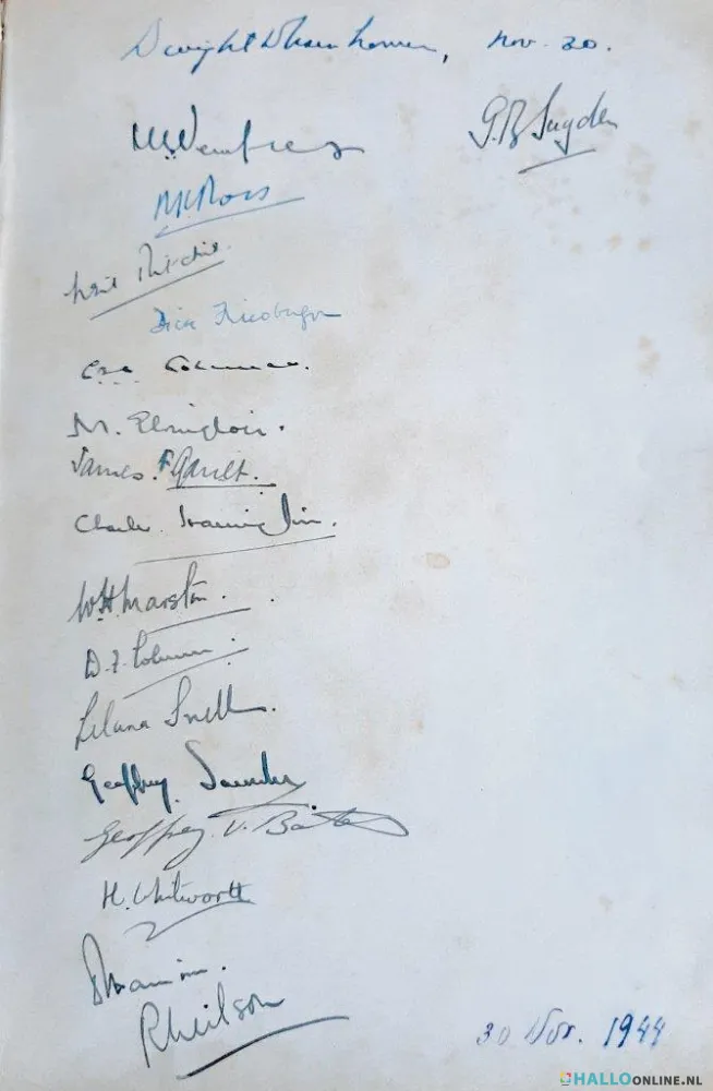 Na het diner bezat mijn moeder de tegenwoordigheid van geest om aan de deelnemers een handtekening te vragen voor in het gastenboekje van haar. Zo komt het dat tussen alle afbeeldingen in haar boekje een bladzijde met handtekeningen van de bevelhebbers aan de stafvergadering staat met helemaal bovenaan die van Eisenhower.
