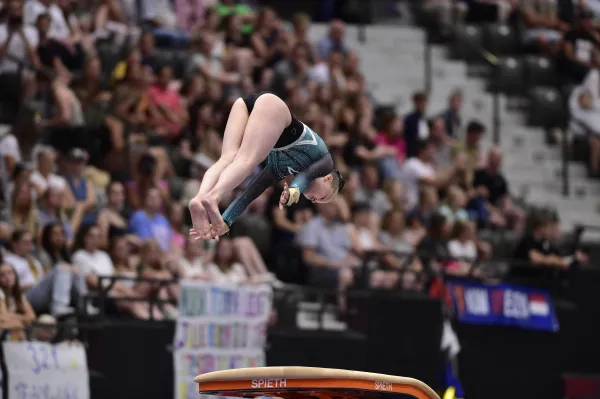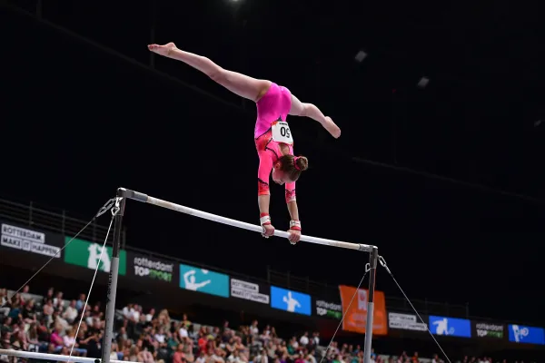 Pleun: “Op dinsdag, woensdag en vrijdag heb ik een ochtendtraining van 8.15 uur tot 11.00 uur. Vervolgens een aantal lesuren en dan een middagtraining van 15.00 tot 18.00. Ik ben pas rond half acht ’s avonds weer thuis. In totaal train ik zo’n 22 uur per week en dat is ook echt nodig om in de eredivisie van het turnen een rol te kunnen spelen.