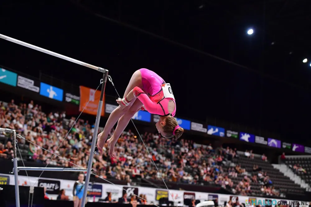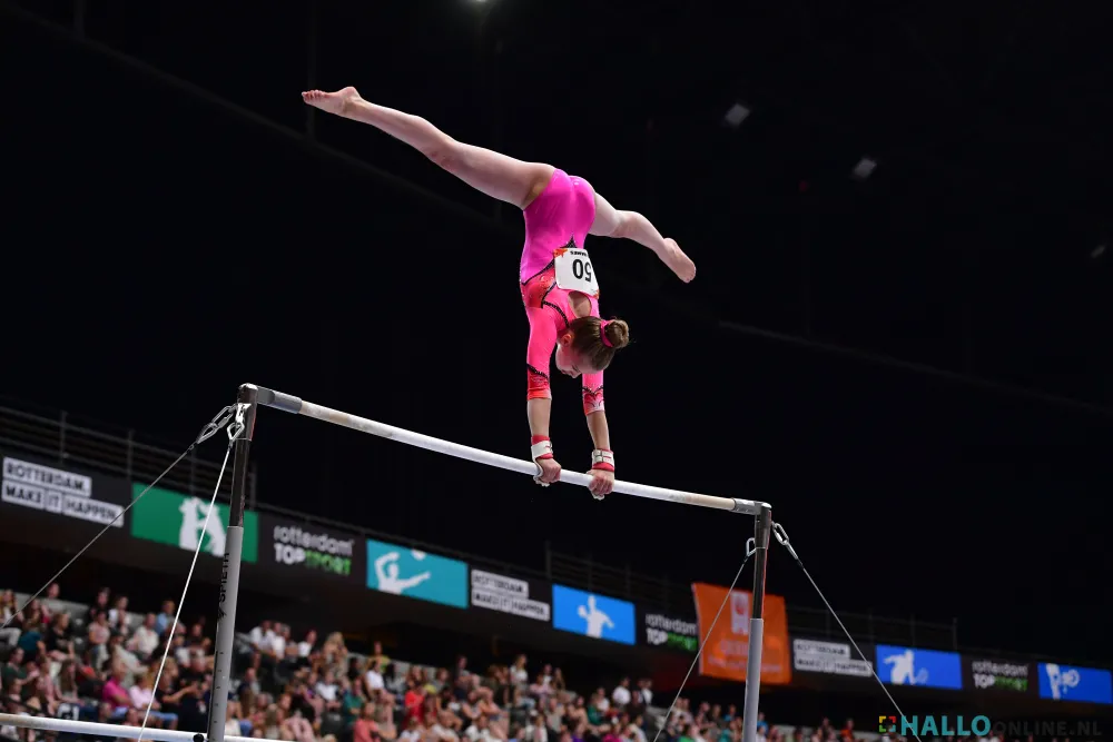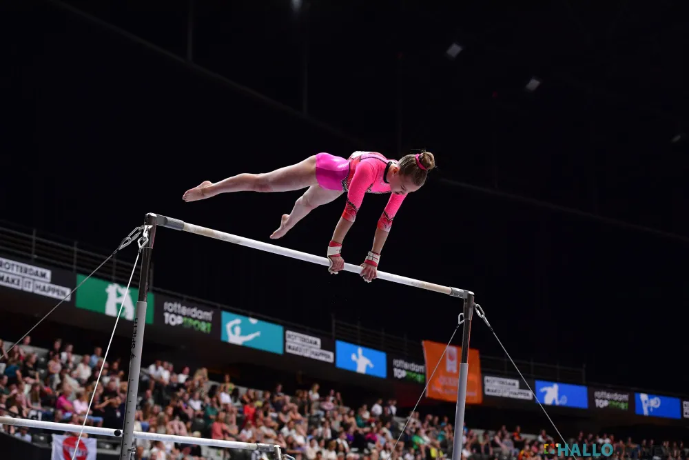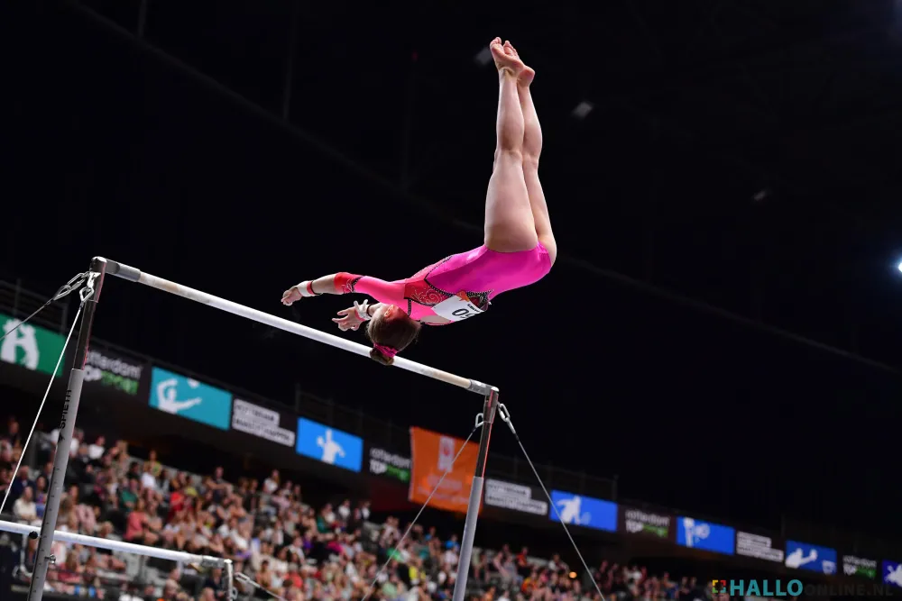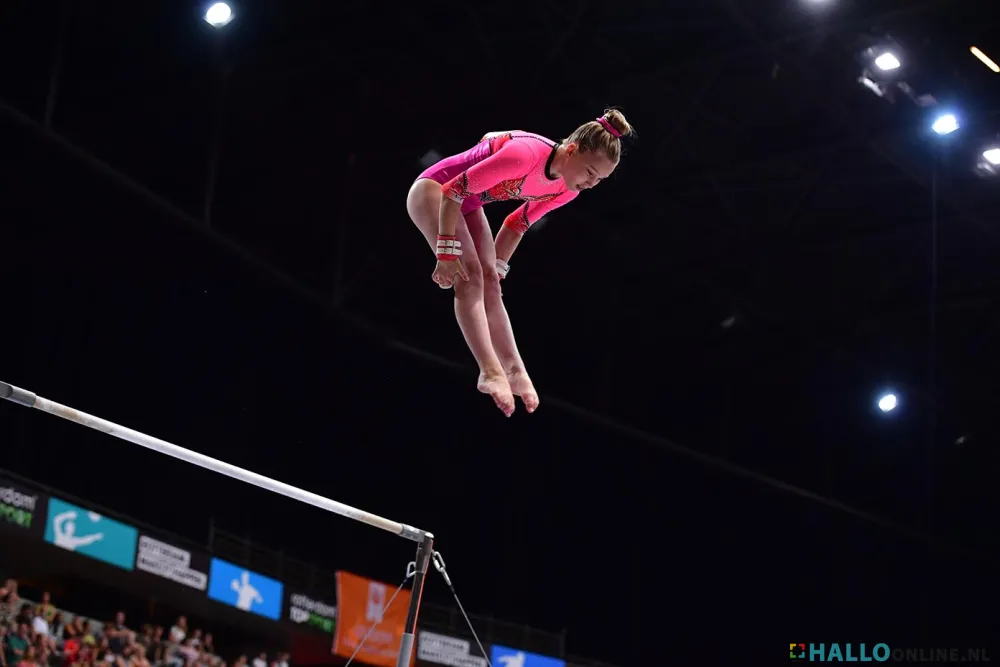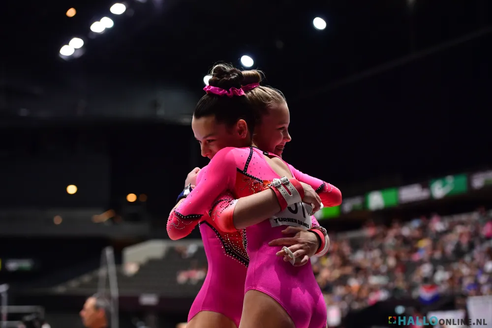 Foto’s zijn gemaakt op het NK afgelopen zomer in AHOY Rotterdam, direct na een goede, mooie en gelukte oefening op de brug met ongelijke leggers. Dit was zo’n moment van trainen, trainen en nog eens trainen en dat het op het juiste moment ook lukt – je ziet ook de opluchting en blijdschap in haar gezichtsuitdrukking en teamgenootje!