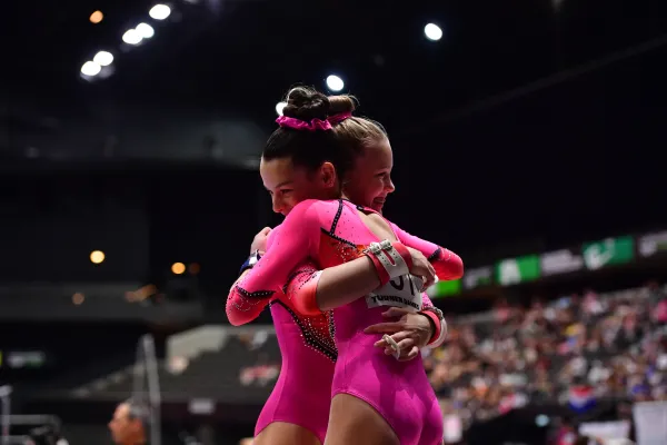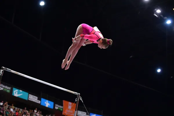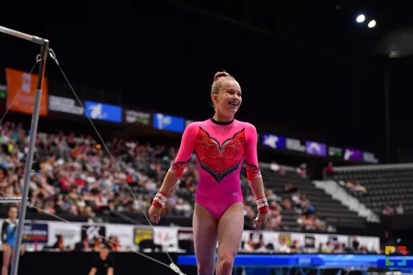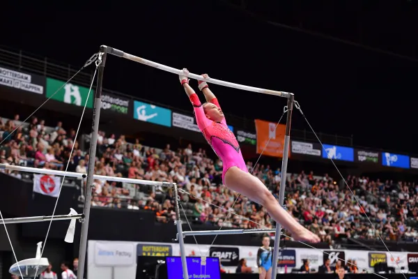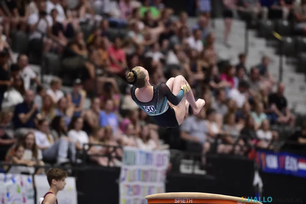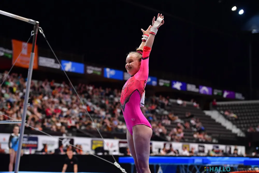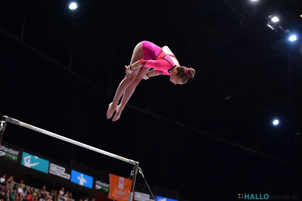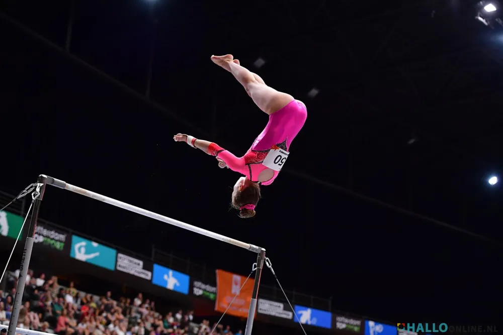 Foto’s zijn gemaakt op het NK afgelopen zomer in AHOY Rotterdam, direct na een goede, mooie en gelukte oefening op de brug met ongelijke leggers. Dit was zo’n moment van trainen, trainen en nog eens trainen en dat het op het juiste moment ook lukt – je ziet ook de opluchting en blijdschap in haar gezichtsuitdrukking en teamgenootje!