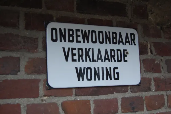 ‘Onbewoonbaar verklaarde woning’ vermeldt het opschrift van een wit geëmailleerd bordje aan de achterkant van de woning van Wim en Janine Simons in Heythuysen. Het huis dat dateert uit 1915 oogt echter bepaald niet als een bouwval, integendeel.