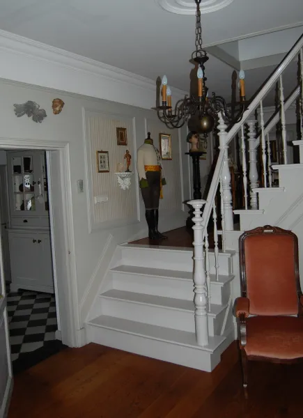 Net als de buitenkant ademt het interieur de sfeer van weleer. De wandhoge lambrisering in de woonkamer is stijlvol uitgevoerd en het plafond is met mooie zelfgemaakte sierlijsten afgewerkt. Diverse binnenmuren zijn afgebroken en nu biedt een trapje vanuit de huiskamer toegang tot de voormalige opkamer waar Wim een gedeelte van zijn verzameling antiek speelgoed in een grote vitrinekast heeft uitgestald. Alles in huis getuigt van het talent en perfectionisme van de maker. Maar ook van goede smaak. Een huis waarin je je direct thuis voelt. Na de rondleiding is er tijd voor een geanimeerd gesprek aan de keukentafel. Wim Simons, oud-leraar tekenen, handvaardigheid en kunstgeschiedenis, verzamelaar en bekwaam restaurateur van antieke voorwerpen, houdt van oud; dat is overduidelijk.