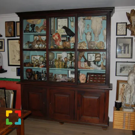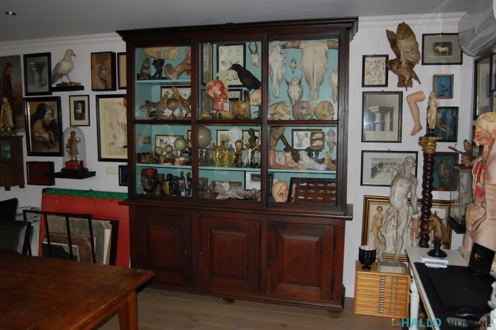 Een grote vitrinekast uit 1850 (!) bevat voorwerpen als botten en schedels en afbeeldingen die de menselijke anatomie verbeelden. Duidelijk Wims passie. Het atelier kijk uit op een fraai symmetrisch aangelegde tuin met buxushagen, paadjes en leibomen. Dat Wim en Janine Simons niet staan te popelen om vaak op vakantie te gaan, behoeft geen verdere uitleg.