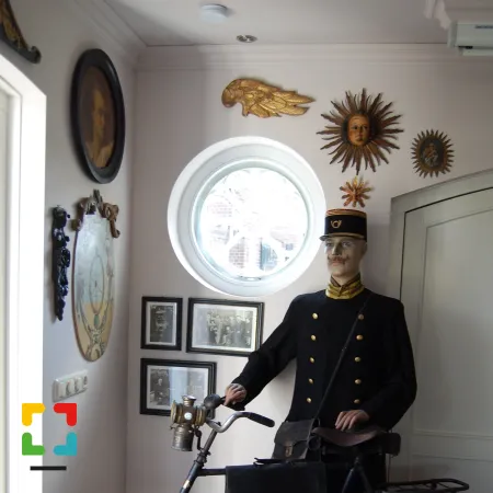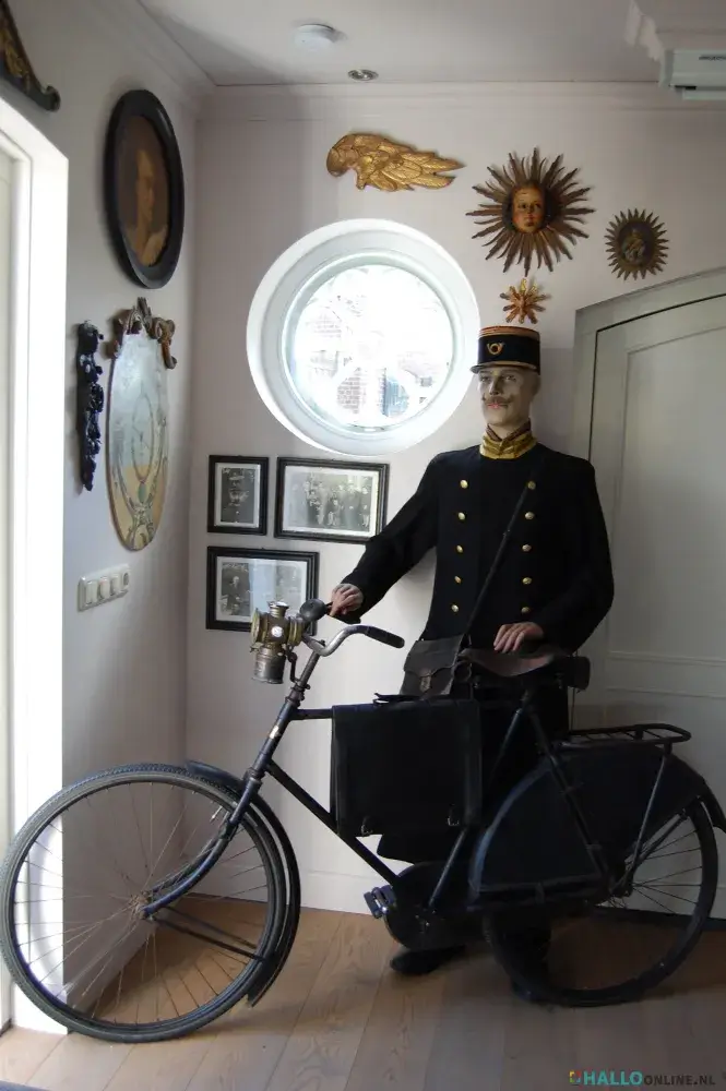 Vijf jaar geleden hebben Wim en Janine een groot atelier laten bouwen in de stijl van hun huis. Wim Simons is hier vaak in de weer met allerlei kunst gerelateerde klussen. “Maar in het atelier is ook plaats voor spullen die ik erg mooi vind”, zegt Wim. Zo staat er een vooroorlogse herenfiets met een levensechte postbode in een ouderwets PTT-uniform. “Een ode aan postbode Hendrickx die hier ooit gewoond heeft”, zegt Wim lachend.
