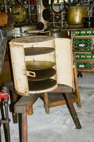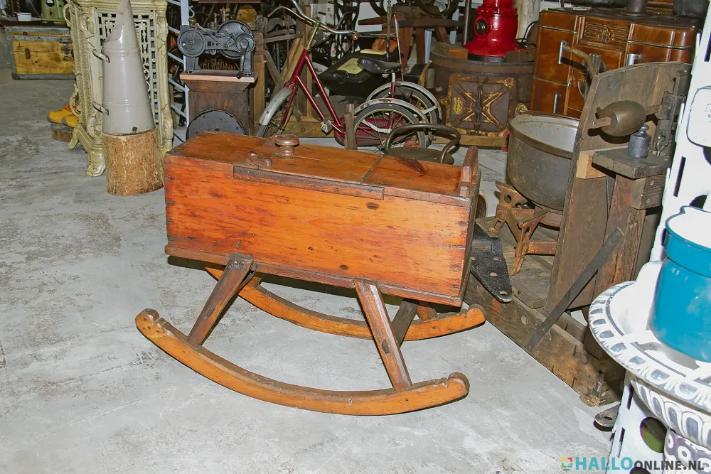 Het afgelopen jaar heeft de familie Nouwen vanwege de pandemie geen bezoekers mogen ontvangen. Frans heeft de tijd gebruikt om een aantal zaken in de grote museumloods te herschikken en om de verlichting te verbeteren, vertelt hij, waarbij hij gelijktijdig een schommelende houten boterkist demonstreert die het voor de boerin vroeger mogelijk maakte twee dingen tegelijk te doen.
