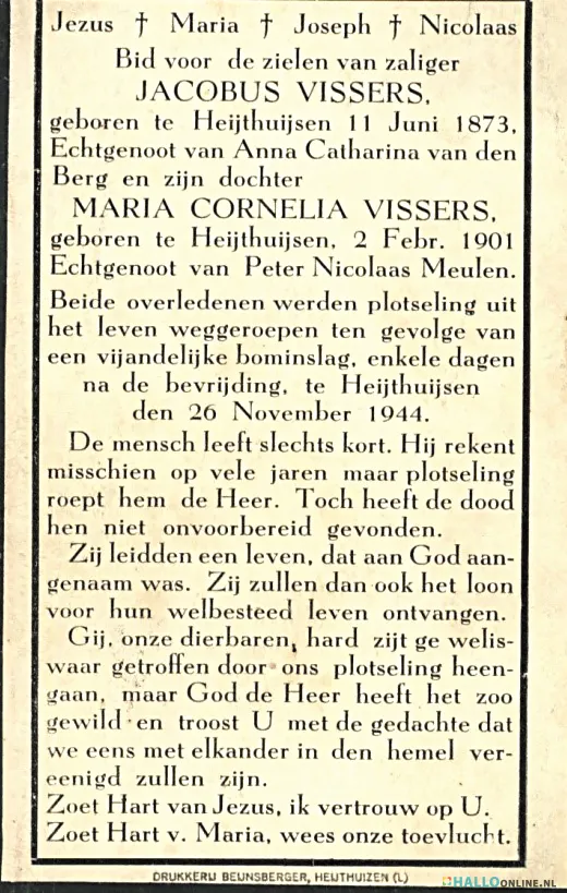 Haar vader Jacobus Vissers heeft ogenschijnlijk maar een kleine wond aan zijn slaap, maar ook hij overlijdt. ‘De mensch leeft slechts kort. Hij rekent misschien op vele jaren maar plotseling roept hem God de Heer die het zo gewild heeft’, meldt de tekst van het bidprentje.